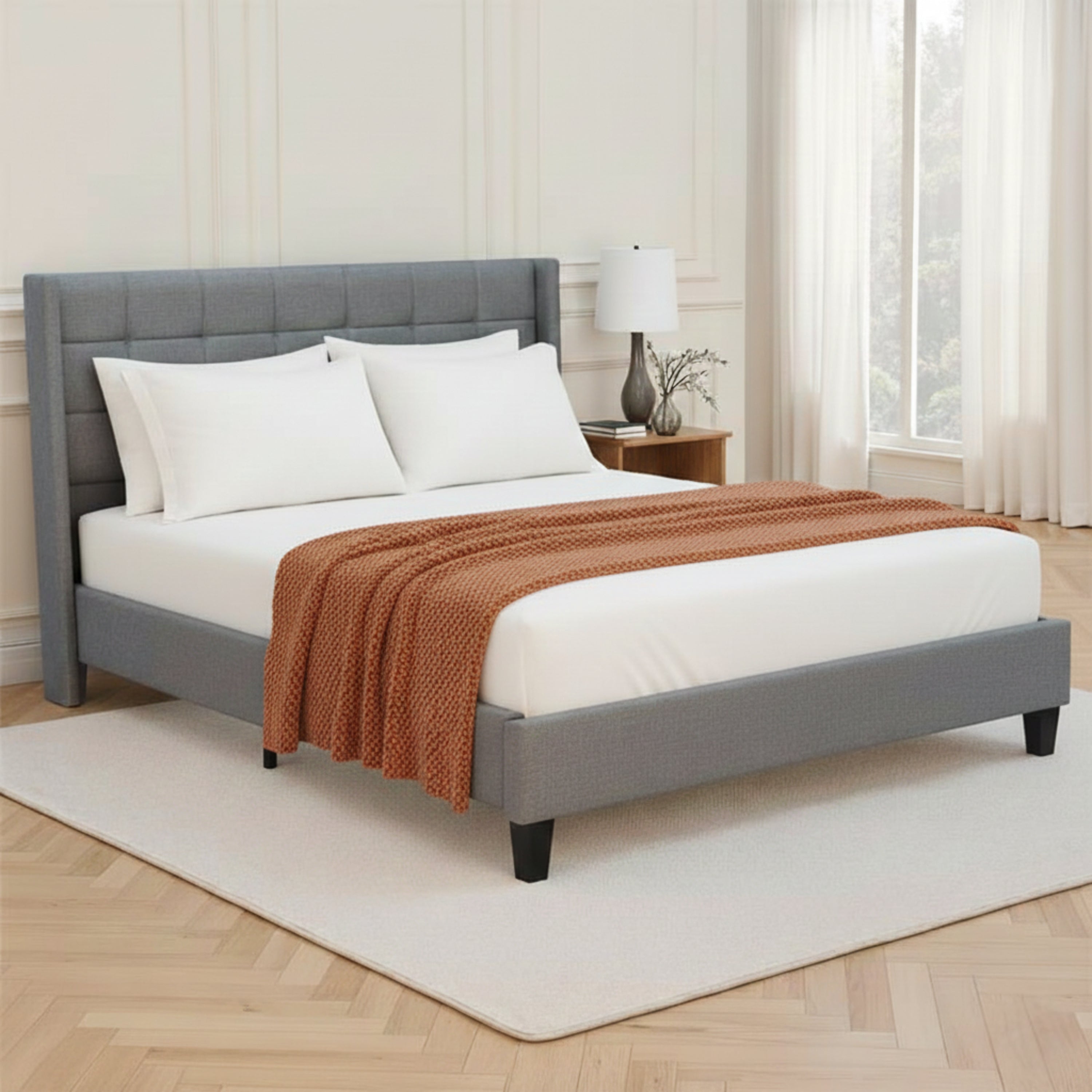 Settle into a bed that blends comfort with reliable strength. The Ora Platform Bed features a square tufted headboard padded with foam, giving you a supportive surface for reading or relaxing. Its gray fabric cover offers a soft, neutral finish that fits easily into any room. A solid wood and engineered wood frame ensures lasting stability, while wooden slats provide strong mattress support without a box spring. Finished with 5-inch legs that add light floor clearance, this platform bed is built for everyday comfort and easy fit.