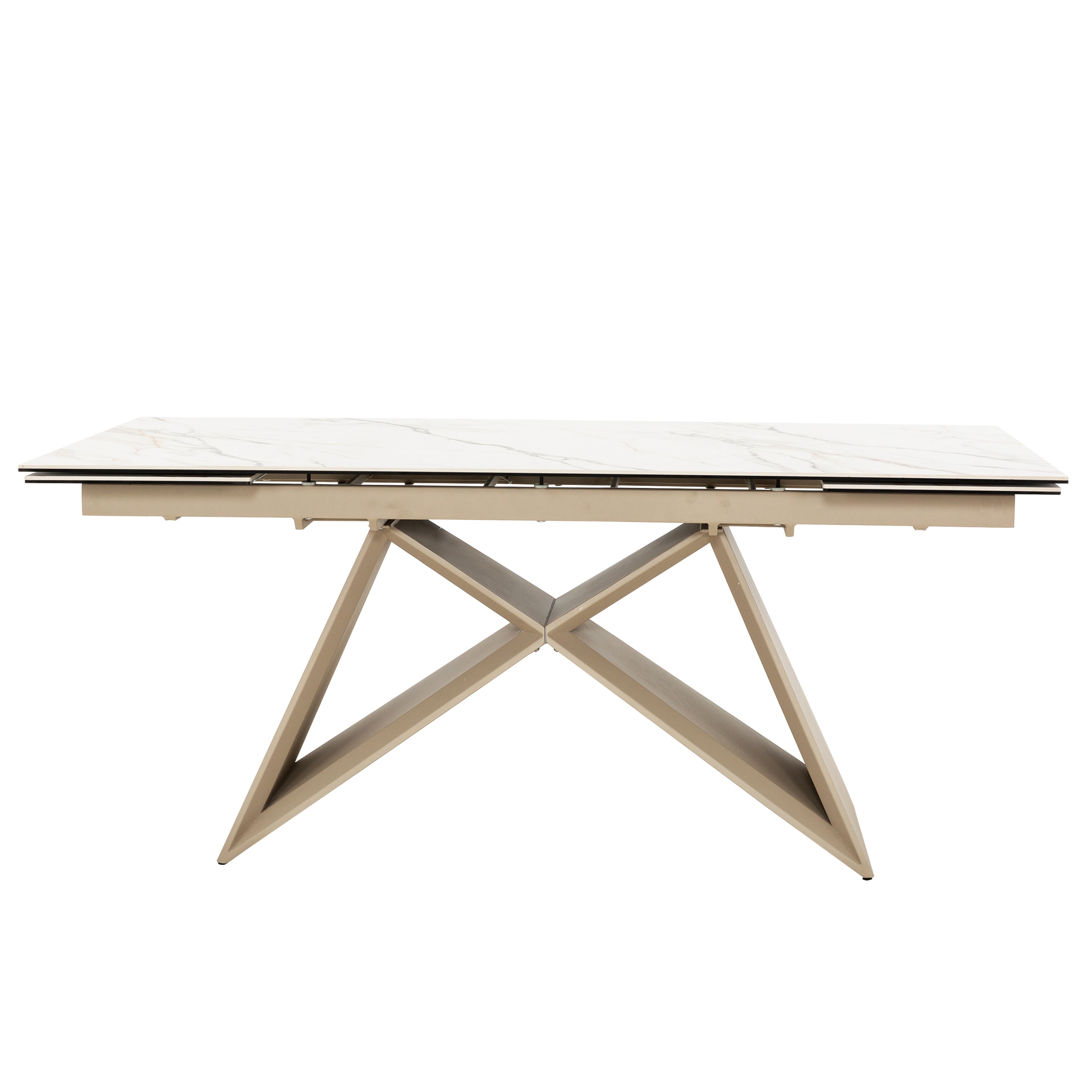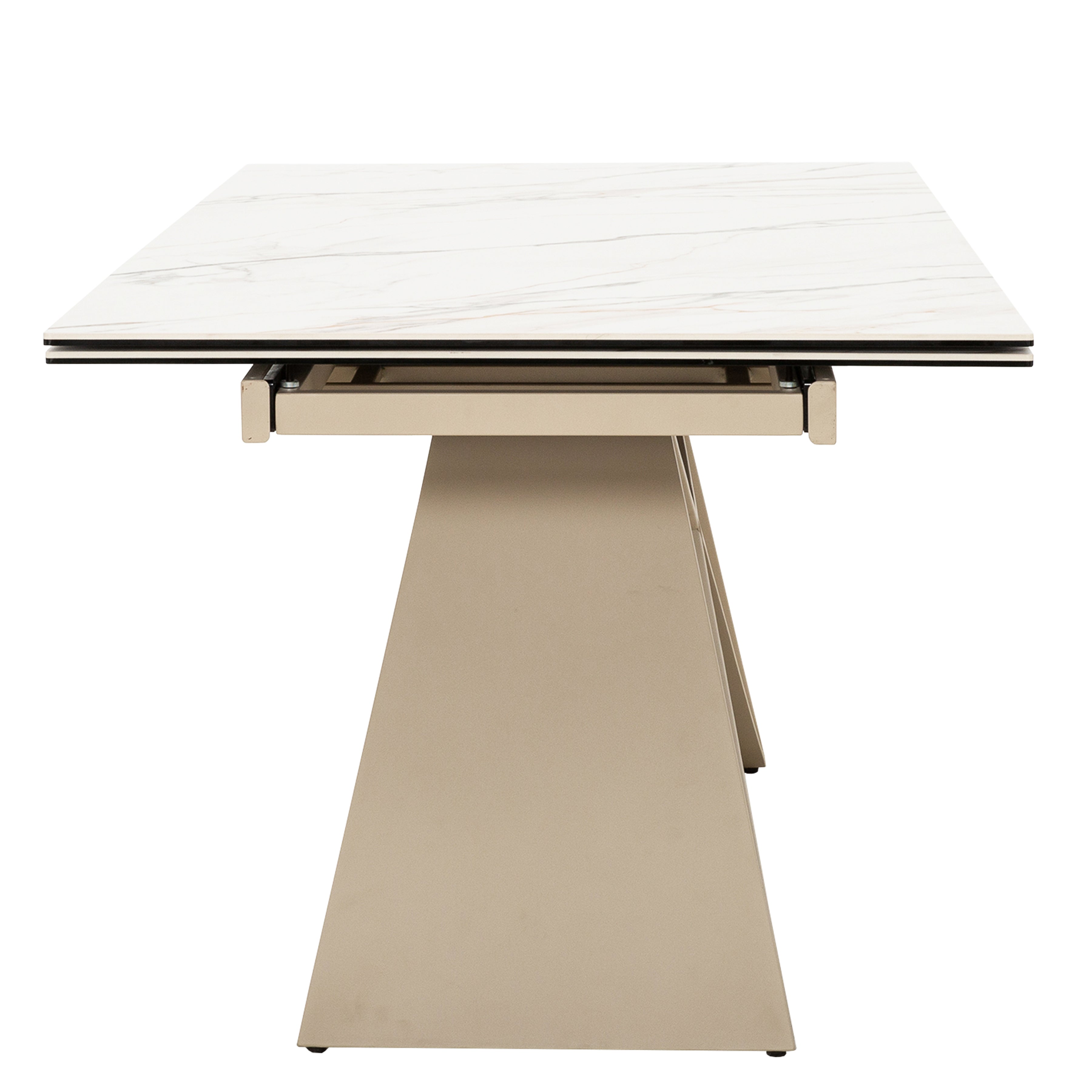Modern lines and easy extension make the 7000 Table a smart fit for today’s dining spaces. The ceramic top features a soft white marble-look finish with subtle gold veining, offering a durable, heat- and stain-resistant surface that’s easy to maintain. A smooth extension mechanism expands the table from each end, giving you quick flexibility for weeknight meals or larger gatherings. The sculptural pedestal base, finished in matte khaki, keeps legroom open while providing stable, well-centered support. Seating six to eight and up to ten when fully expanded, 7000 delivers modern form, reliable function, and long-lasting durability in a streamlined design.