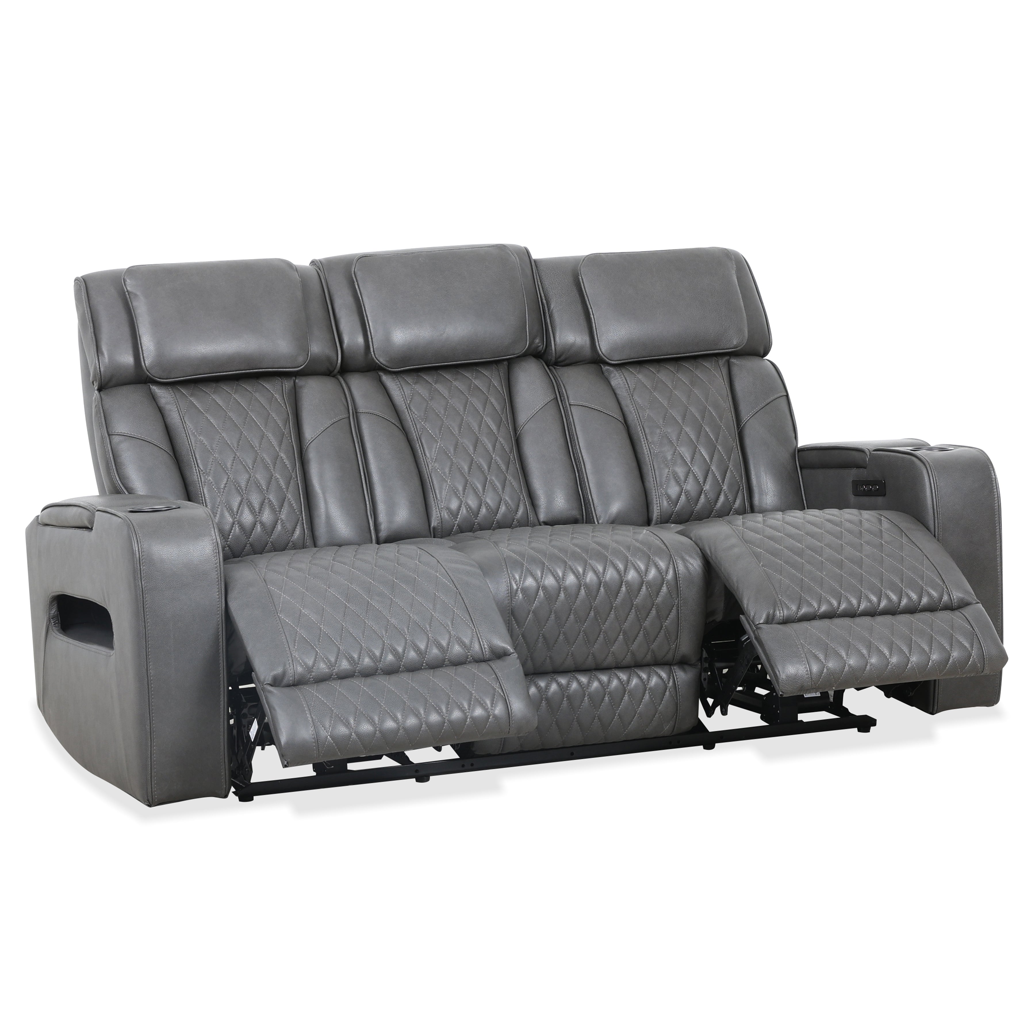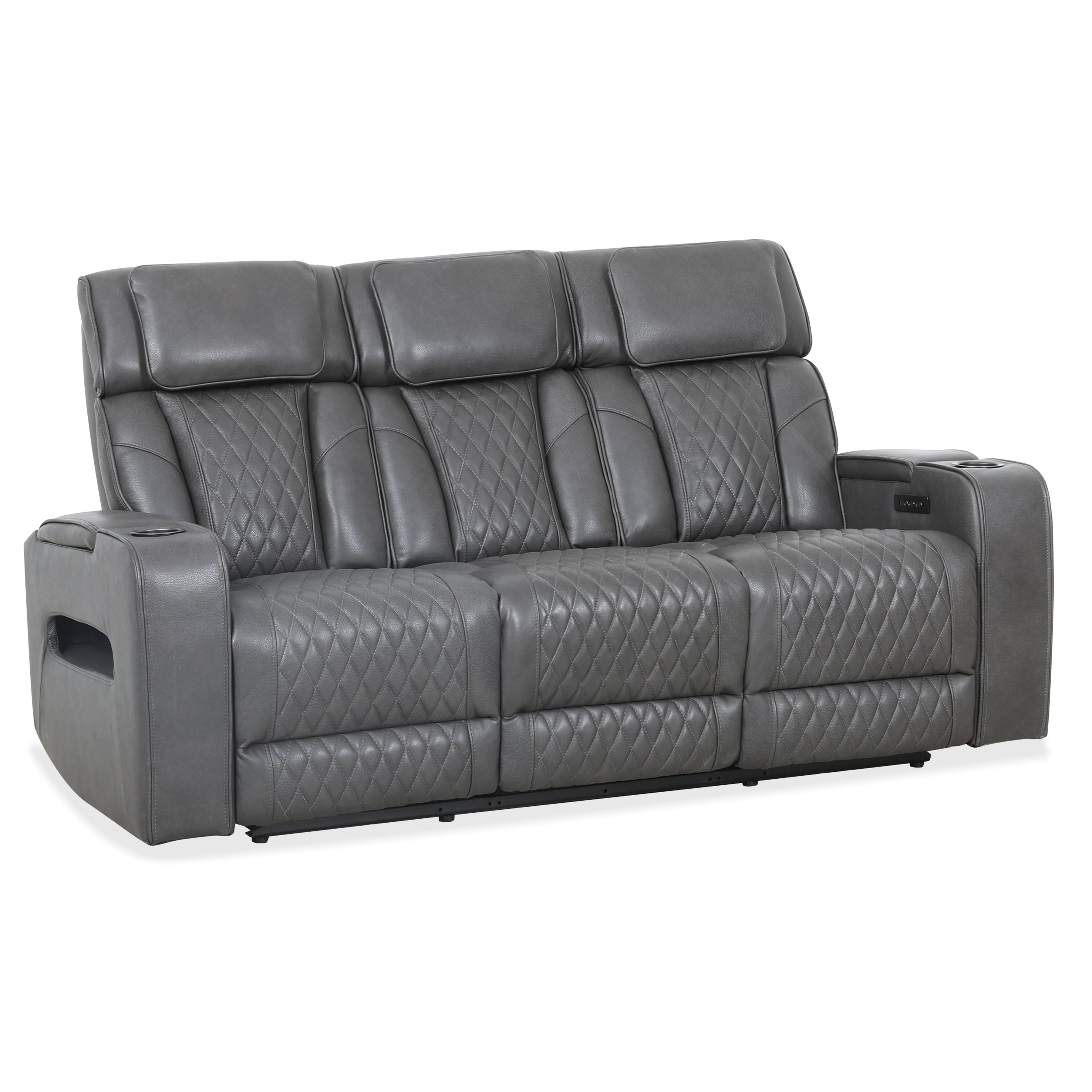 Built for the way you really lounge, the Colton Power Reclining Sofa blends tech, storage, and bold style into one feature-rich design. Upholstered in quilted leather match for a high-contrast look, it includes dual power recliners with tall, diamond-tufted backs and padded headrests that adjust independently for full-body comfort. The center seat stays fixed, while the sides recline smoothly with touch-button control. Hidden compartments in both arms keep clutter out of sight, while cupholders add convenience within reach. The center seat flips down to reveal a smart console with stainless steel cupholders, dual reading lights, and extra space for snacks, remotes, or devices. Integrated USB and Type-C ports in the side control panel let you stay charged without moving, and LED-lit side compartments provide a soft glow—and even more storage.