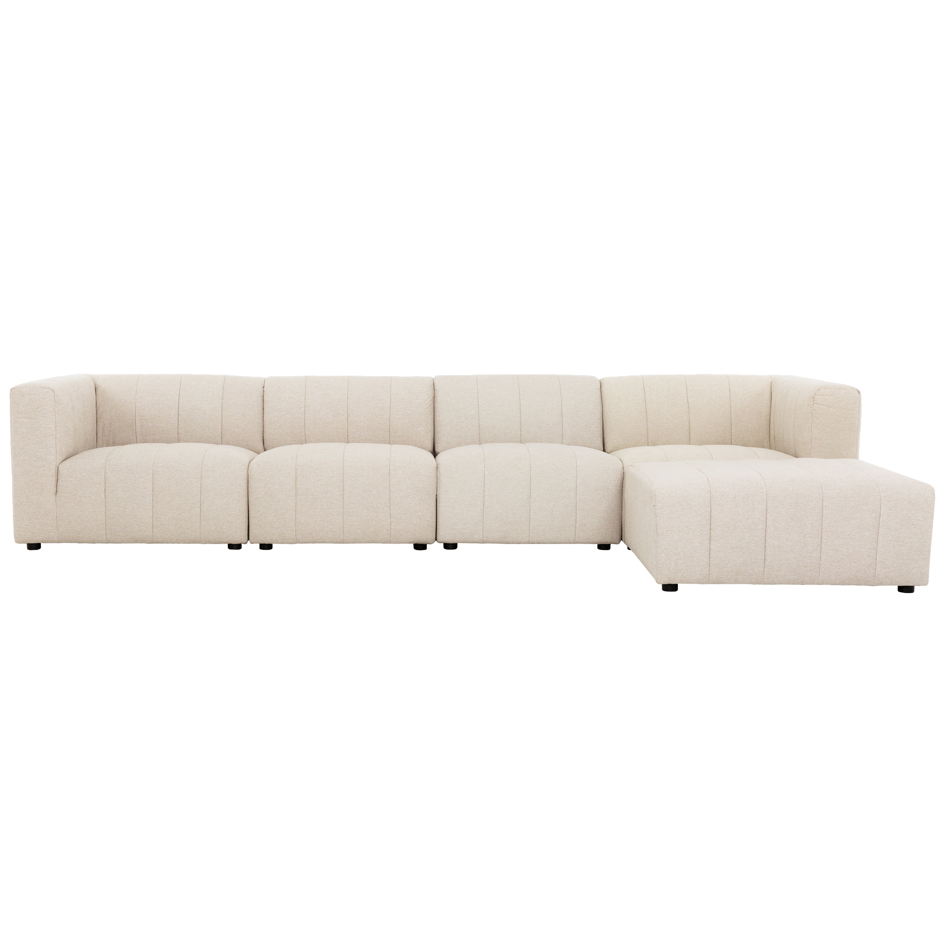 Redefine how you lounge with the Lauriston 5-Piece Modular Sofa with Ottoman — a flexible seating system designed to evolve with your space. Its modular form lets you arrange, expand, or refresh your layout whenever inspiration strikes. Crafted with a durable wood frame for everyday strength, it’s built to support deep, spring-cushioned comfort that lasts. Channel-stitched upholstery adds dimension and texture, while the smooth, refined fabric brings warmth and modern elegance to any room.