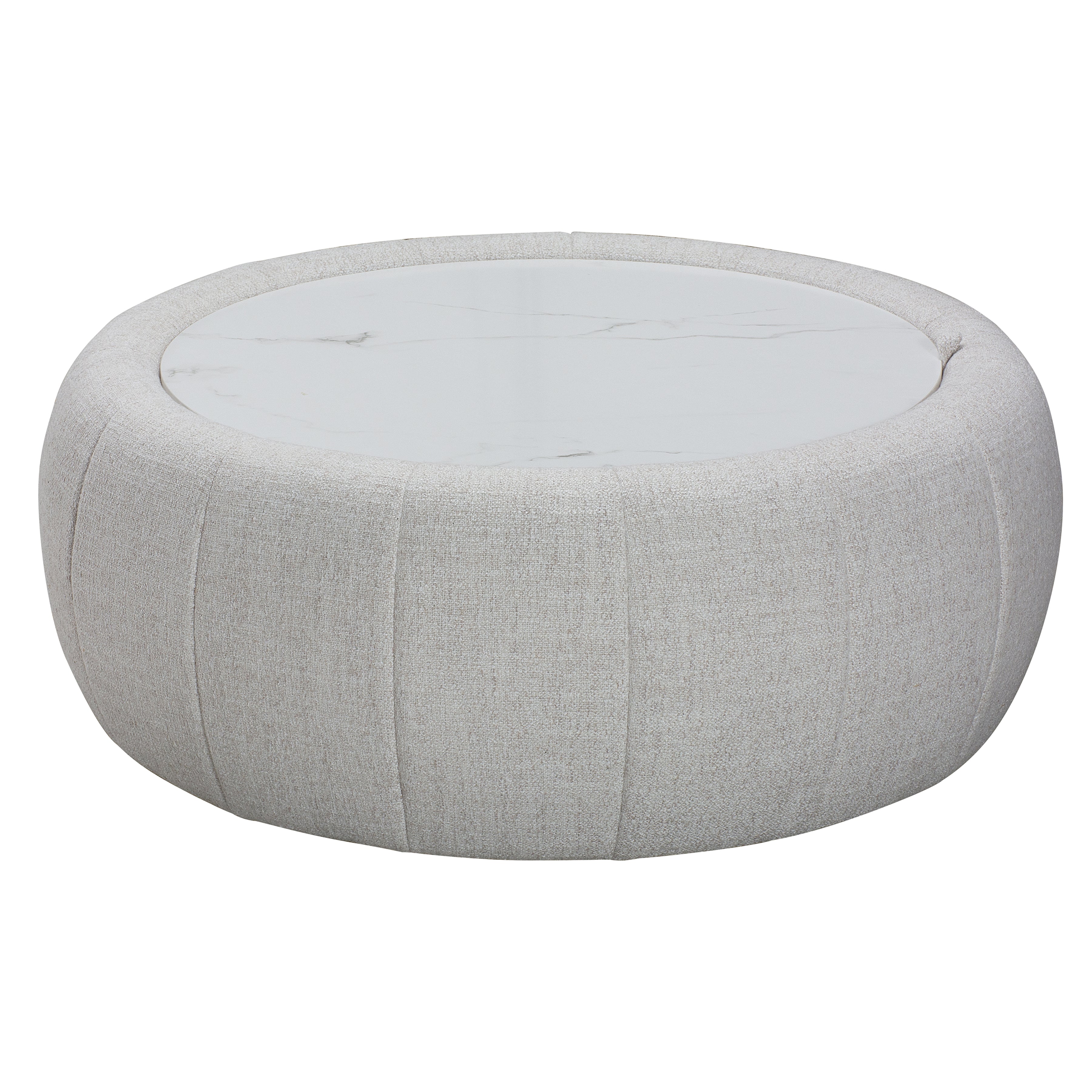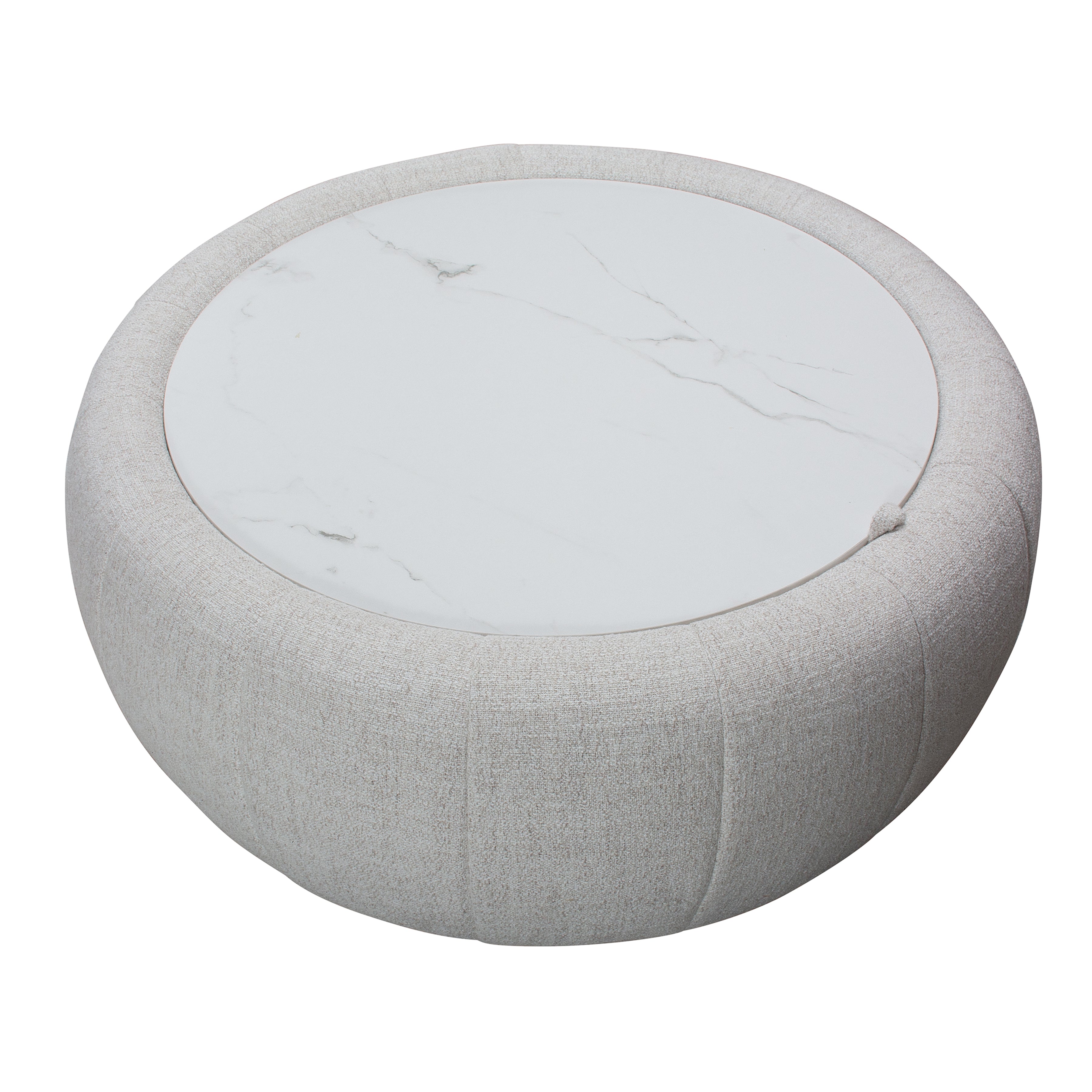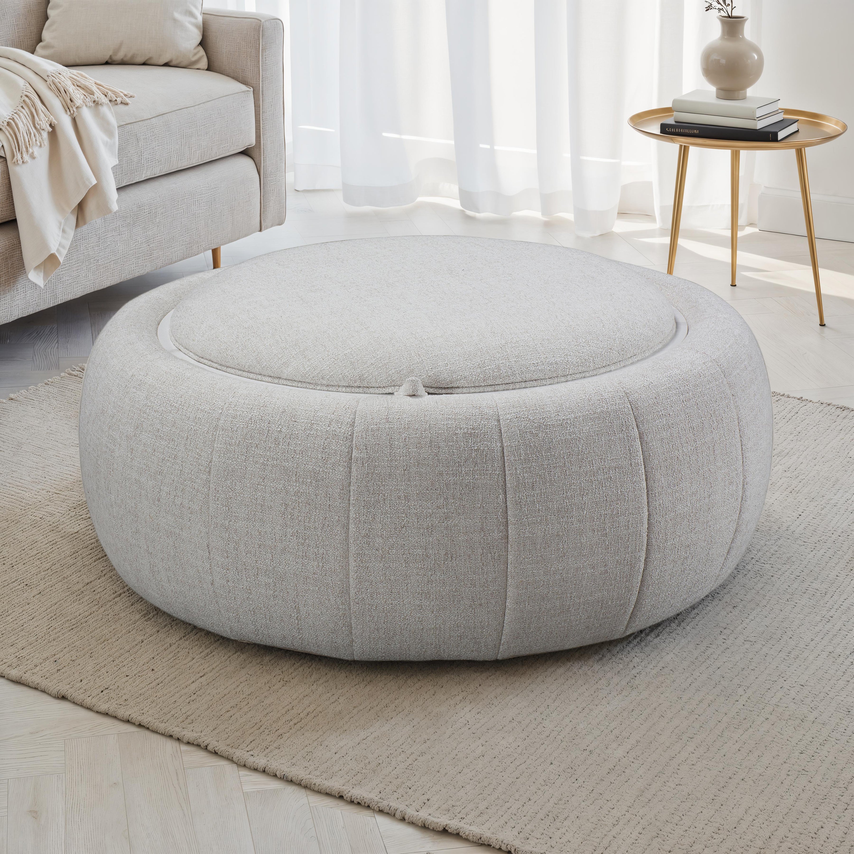 The Oros Ottoman combines everyday comfort with versatile design. Its round, upholstered silhouette brings a soft, inviting touch, while the cushioned top doubles as a footrest or extra seat. Flip the lid to reveal a smooth faux-marble surface, perfect for setting down drinks, trays, or décor. A hidden storage compartment inside keeps blankets, magazines, or other essentials neatly out of sight. Built with a durable wood frame, the Oros offers dependable support and long-lasting stability. Whether styled as a centerpiece or placed beside a sofa, it adds both practicality and refined style to your living space.