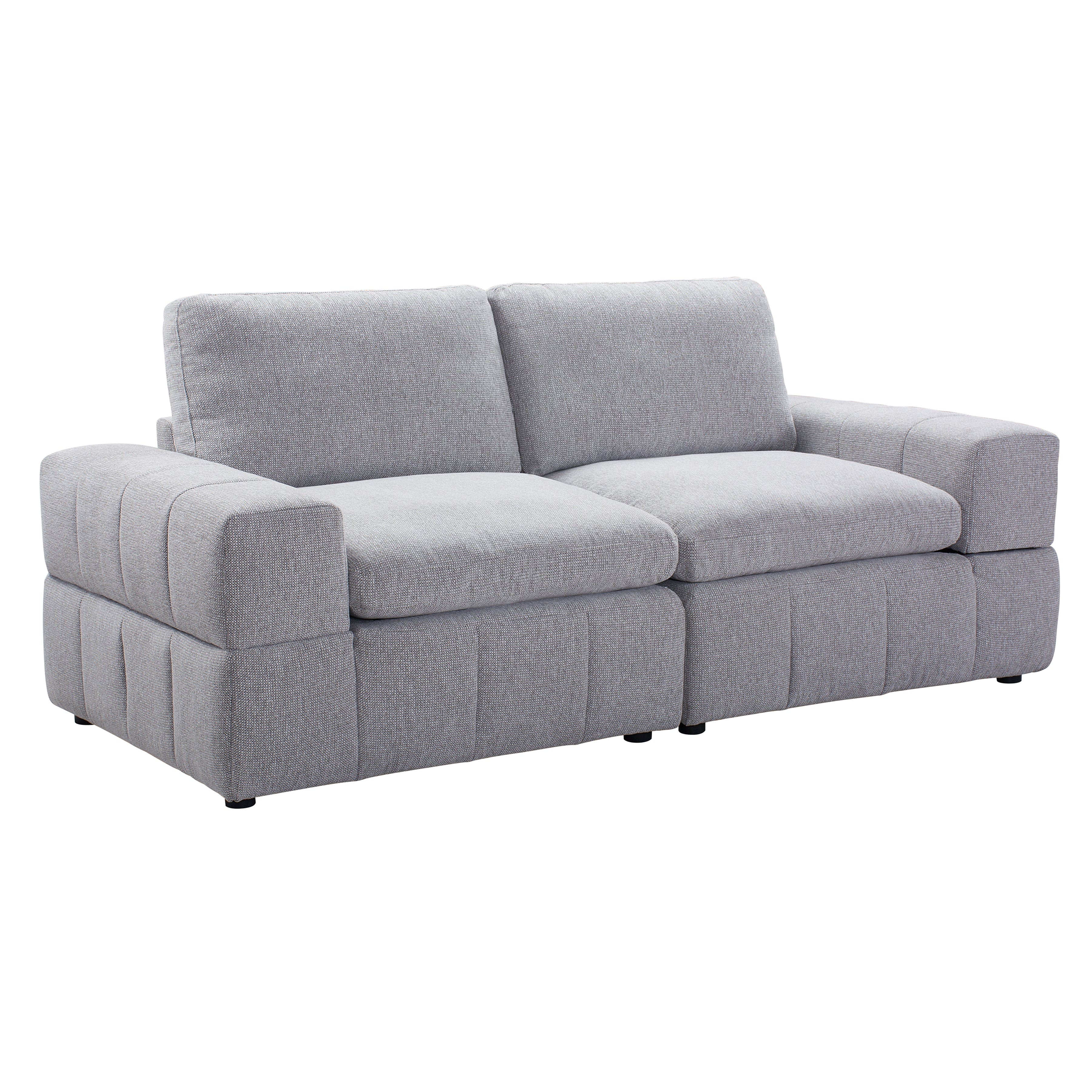 Compact and versatile, the Momento 2-Piece Modular Loveseat delivers comfort in a streamlined size. Wide arms and deep cushions create an inviting spot for two, while foam and spring-blend support keeps seating balanced and durable. Channel tufting along the base adds tailored detail, and light grey upholstery makes it easy to style in apartments, bedrooms, or smaller living rooms. Built from left-arm and right-arm chairs, this loveseat stands alone beautifully or expands seamlessly with other Momento modules.