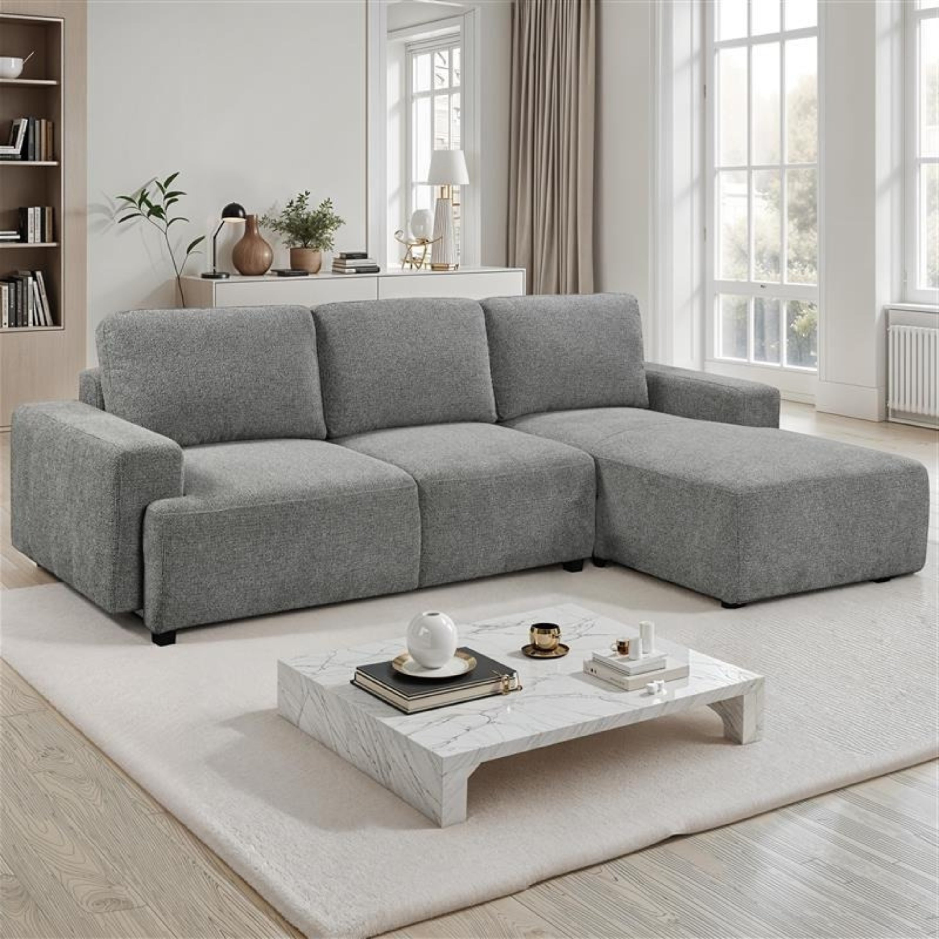 The Chiara sectional brings a streamlined shape and versatile comfort to modern living spaces. Wide arms and deep cushions create a low, tailored profile that feels relaxed yet modern. By day, it’s a spacious spot to stretch out; by night, the hidden sleeper function converts it into a bed for overnight guests. Upholstered in soft grey fabric, Chiara offers a neutral backdrop that blends easily into any home. With a solid and engineered wood frame and a supportive spring foundation, it’s built for everyday comfort that lasts.