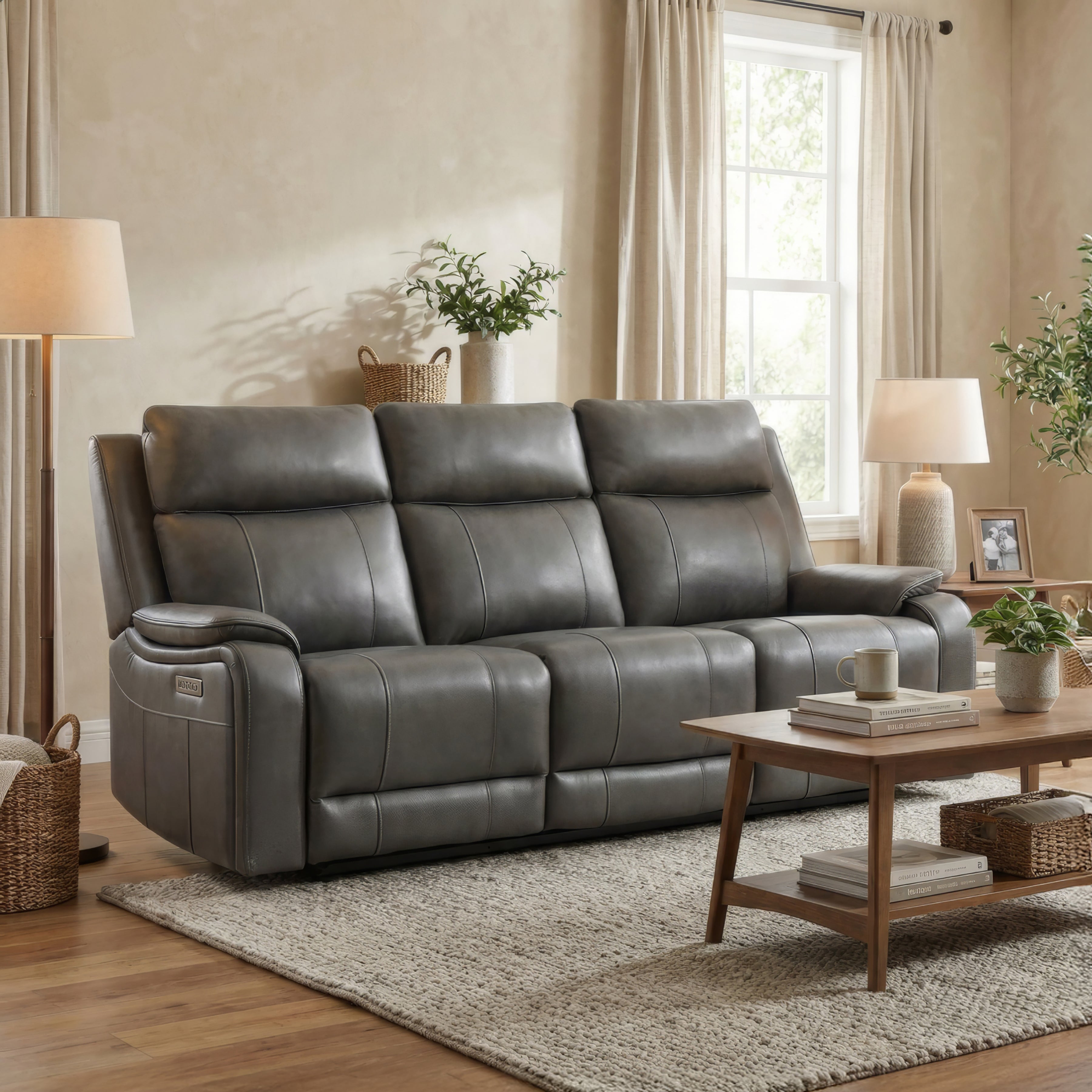The Brindle Power Reclining Sofa brings comfort, support, and smart features together in a clean, everyday design. Dual power recline seats adjust smoothly with the press of a button, while tall backrests and padded armrests provide full-body comfort across the frame. Upholstered in leather match, it balances a sleek look with easy-care durability. High-resiliency foam cushions offer lasting support, and the center console includes USB and Type-C ports to keep your devices powered. A wall-hugging recline mechanism lets the sofa sit closer to the wall—ideal for maximizing space in your living room.