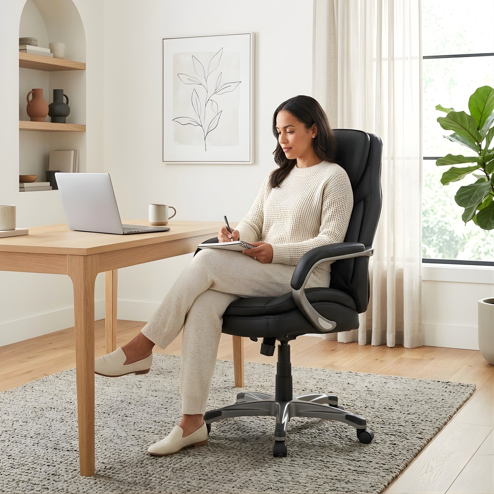 Designed for long-lasting comfort, the Palisade Office Chair blends supportive construction with a sleek, faux leather finish for a polished workspace upgrade. The memory foam seat cushions your posture while a pocket coil core maintains resilience through extended hours. Its height-adjustable gas lift lets you find the perfect position for focus, while the tilt function adds flexibility for quick posture shifts. A sturdy plywood frame provides dependable support, and smooth-rolling nylon casters make it easy to move between tasks. Whether for home or office, this chair delivers durability, comfort, and everyday style you’ll appreciate from the first sit.