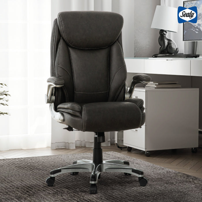 Upgrade your workspace with the Sealy® Ryder High Back Executive Office Chair, where luxury meets productivity. Wrapped in premium bonded leather, this chair delivers a plush, professional feel while offering the durability needed for long hours at your desk. The memory foam-padded seat and high back provide exceptional support, keeping you comfortable from early meetings to late-night projects. Flip-up padded armrests give you the flexibility to move freely when needed, while the recline function allows you to find the perfect position to recharge. Built on a sturdy base with smooth-rolling casters, the Ryder chair is ready to elevate your workday—one task at a time.